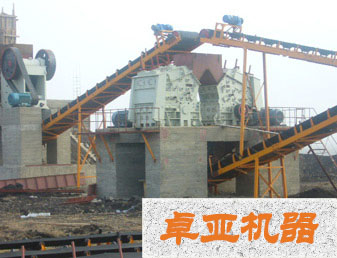 大块石料经料仓由振动给料机均匀地送进PE1000X1200鄂式破碎机进行粗碎,粗碎后的石料由胶带输送机送到 ZYS66"-B圆锥式破碎机进行进一步细碎,细碎后的石料由胶带输送机送进2YZS2460振动筛进行筛分,筛分出不同粒度级别的石子,符合粒度要求的石子分别由胶带输送机送往成品料堆,不符合粒度要求的大块石子由胶带输送机送到 ZYS51"-B圆锥式破碎机再次破碎,细碎后的石料由胶带输送机送进2YZS2160振动筛进行筛分,筛分出不同粒度级别的石子,符合粒度要求的石子分别由胶带输送机送往成品料堆,不符合粒度要求的大块石子由胶带输送机返回到ZYS51"-B圆锥式破碎机进行再次破碎,形成闭路多次循环。根据环保需要,可配备除尘设备。